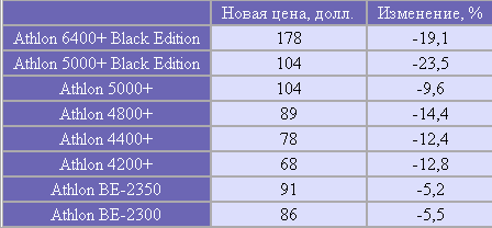 Изменила свой официальный прайс-лист компания AMD, подтвердив, таким образом, предварительную информацию, публиковавшуюся нами в конце декабря. Заметно подешевели все три четырёхъядерных CPU семейства Phenom. Для моделей 9600 и 9600 Black Edition установлена цена 251 доллар, что означает снижение на 11% по сравнению с прежней. Еще большее снижение коснулось Phenom 9500, ранее стоившего как раз 251 доллар. Сейчас оптовая стоимость таких процессоров составляет 209 долларов (-16,7%). В линейке Athlon были скорректированы цены моделей со свободным коэффициентом умножения, а также ряда младших процессоров. Изменения сведены в таблицу: Кроме снижения цен, AMD также представила одну новую модель CPU. Ею стал энергоэффективный Athlon BE-2400 с тепловыделением в 45 Вт, работающий на частоте 2,3 ГГц. Его оптовая цена составит 104 доллара в партиях от 1000 штук.